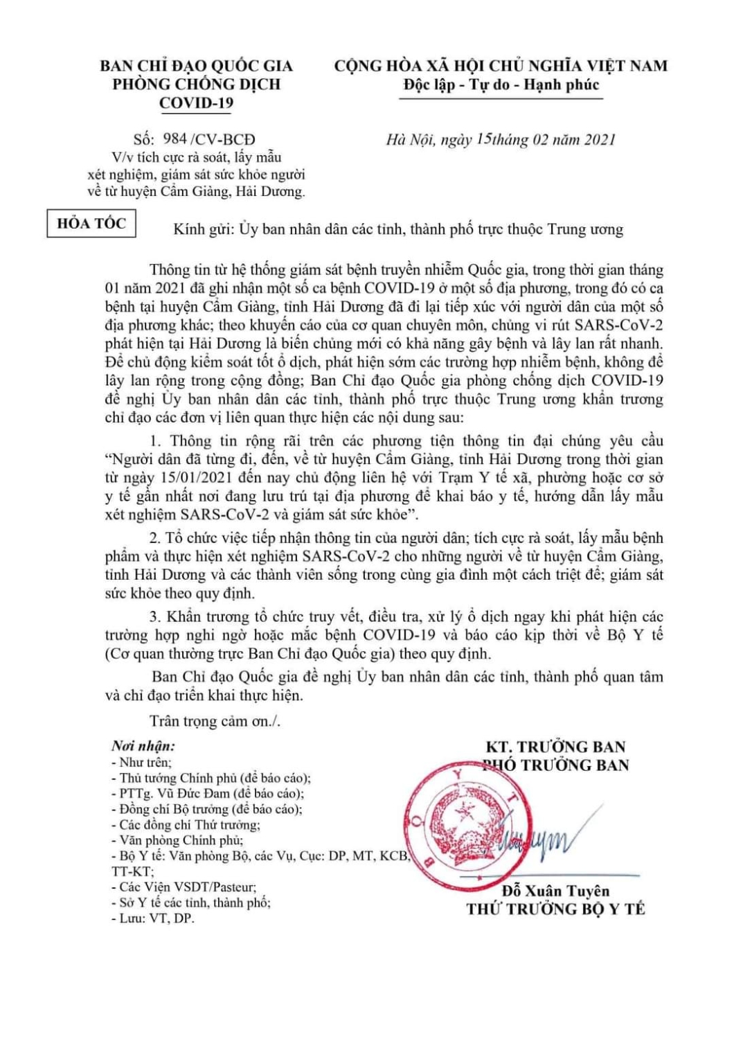 Công văn của Ban Chỉ đạo Quốc gia phòng, chống dịch Covid-19 về tích cực rà soát, lấy mẫu, xét nghiệm, giám sát sức khỏe người về từ huyện Cẩm Giàng, Hải Dương